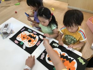 タンポで色付けした物の上から、ペタペタと糊付けしカボチャのお顔を付けたりキャンディーをつけたりと、糊付けがとても上手になって来ました🎃✨