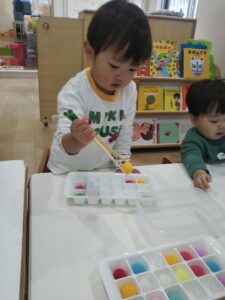 また別の時にした「あけ移し」遊びでは、一緒にしているお友達の様子を見て、同じようにやりたい!とピンセットやお箸にも挑戦しました!