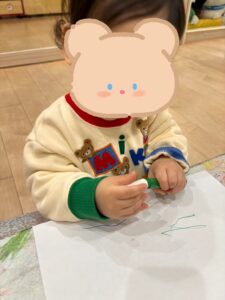 ペンに興味津々✨そして、やる気十分でした!最後にはシールも貼って素敵な作品ができあがりました。まだやりたくてペンを離さない姿もあり、お絵描きが好きなひよこ組さんです(*ˊ˘ˋ*)